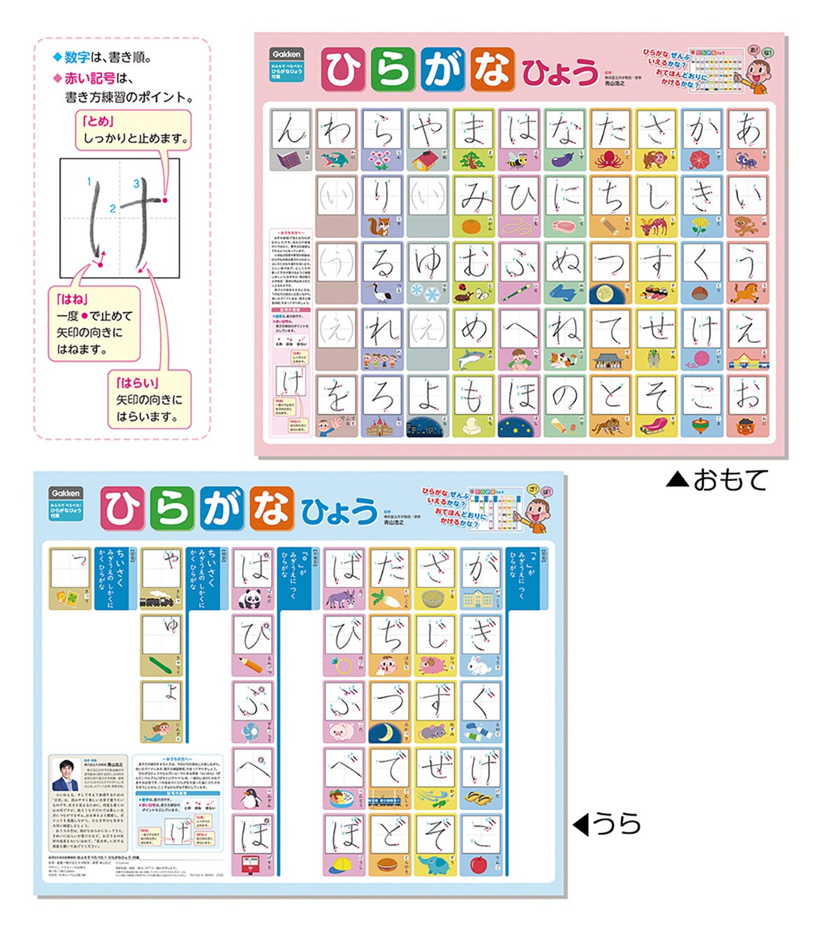 ◆「ひらがなひょう」1枚……大判ポスタータイプのひらがなひょうです。表面が清音、裏面が濁音などの表になっています(W490×H392mm)。お手本(範書)を掲載していて、書き順や書き方のポイントもわかります。お風呂では掲示することができません。