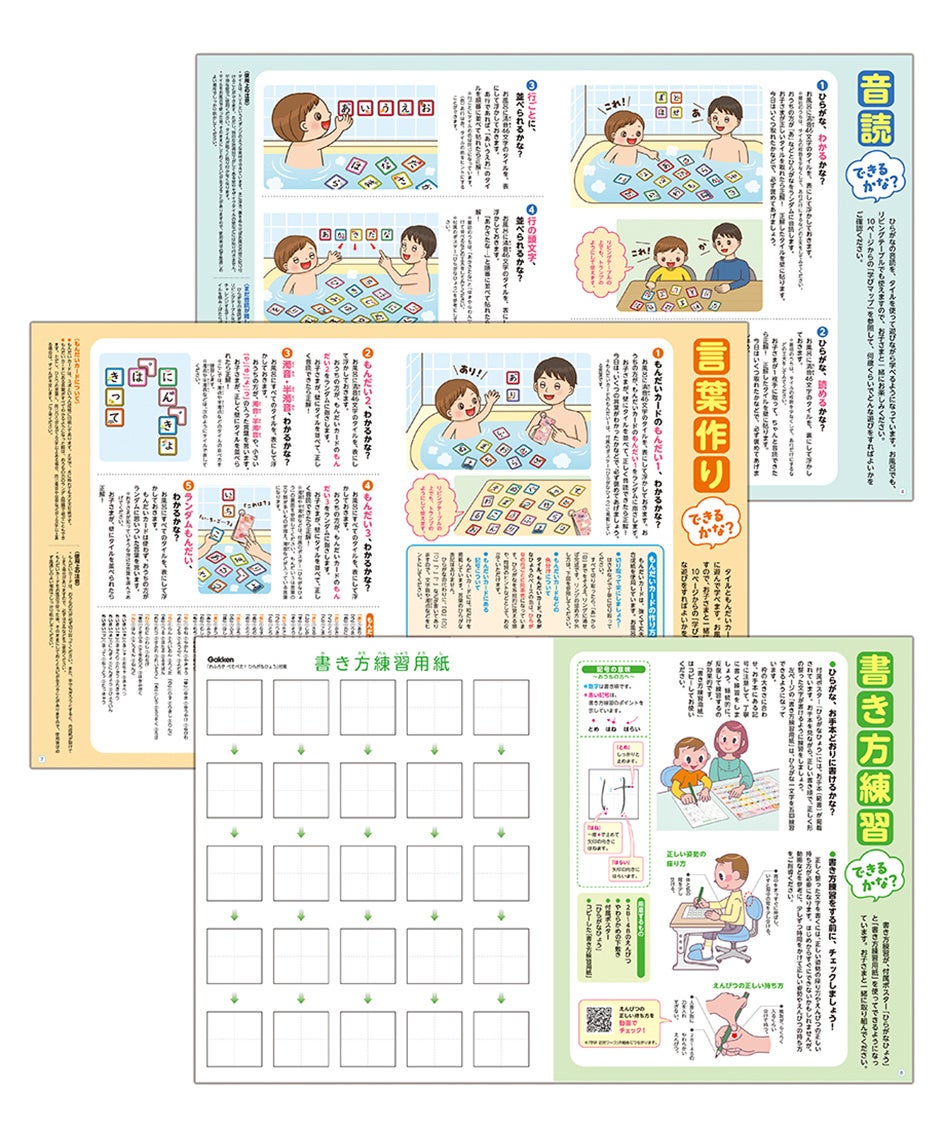 お風呂でもリビングでも、クイズ遊びを通して、音読や言葉作りが学べます。範書を掲載した「ひらがなひょう」をお手本にして、書き方練習もできるようになっています。
