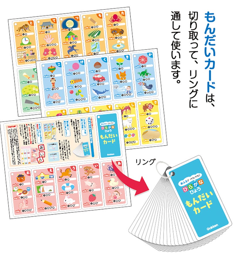◆「もんだいカード」25枚(50面)……タイルと一緒に使う、クイズの問題です。お風呂でも使用可能。単語帳のように綴じることができるリング付き。切り取りやすいように、あらかじめミシン目が入っているので、作り方は簡単です。
