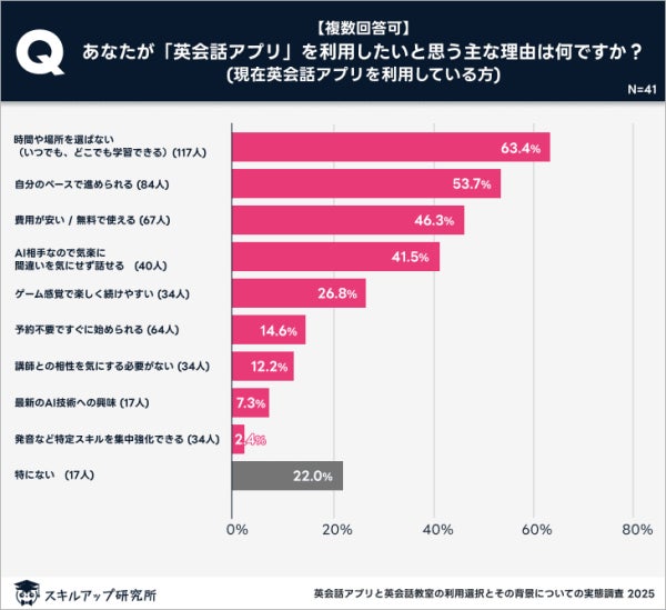 現在英会話アプリを利用しているユーザーにその主な理由を尋ねたところ、「時間や場所を選ばない(いつでも、どこでも学習できる)」「自分のペースで進められる」「費用が安い / 無料で使える」がトップ3を占め、非常に高い割合を示した。