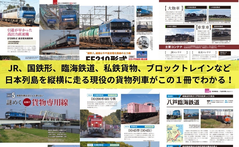 JR、国鉄形、臨海鉄道、私鉄貨物、ブロックトレインなど、貨物列車を徹底網羅。貨物には欠かせない「貨車」「コンテナ」事典もあわせてチェックできます。路線と貨物駅、機関区がひと目でわかるMAPつきなので、路線やスペック、配置機関区等の資料や用語集など、入門者からファンまで楽しめます。