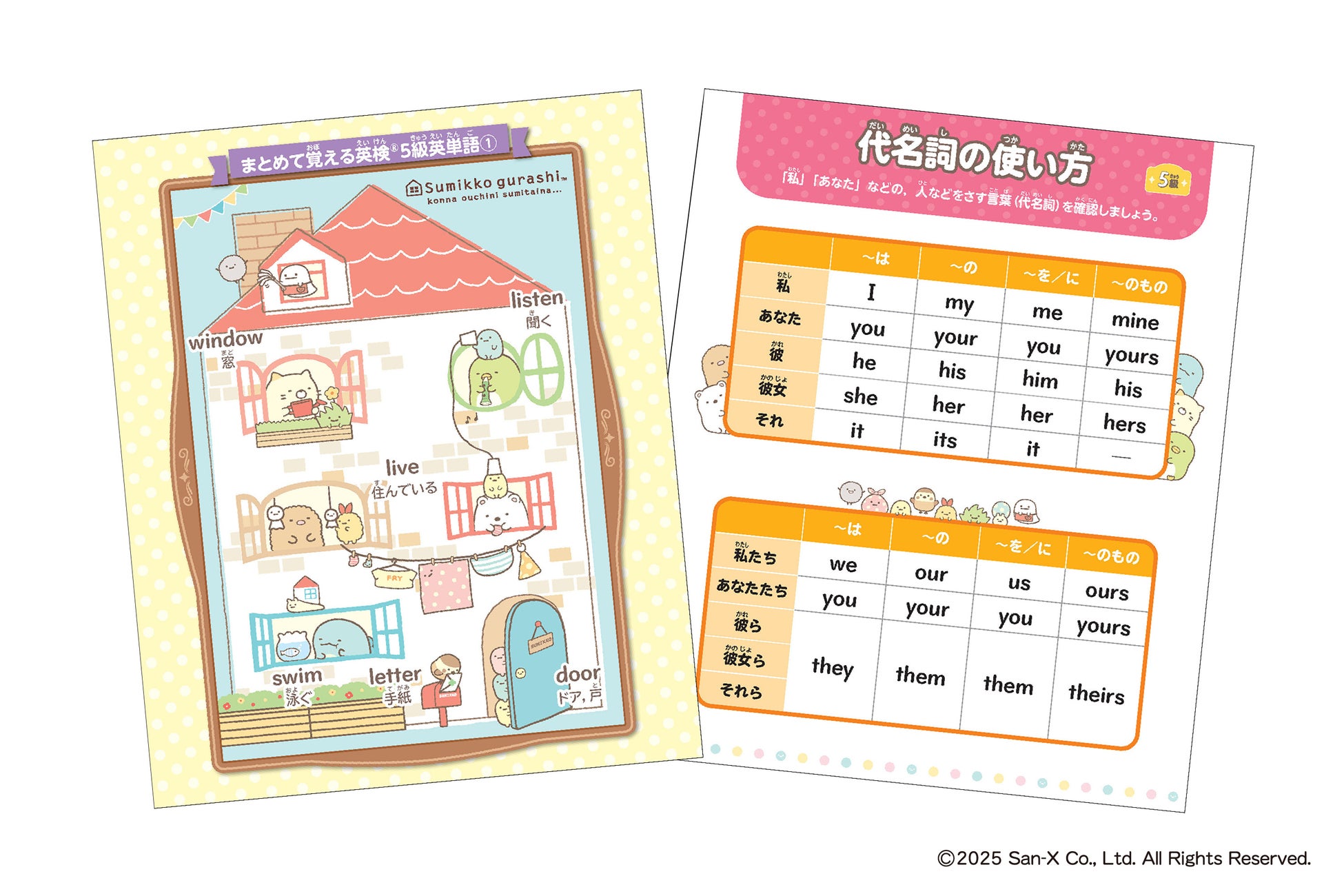 すみっコたちの絵で覚える英検頻出の英単語シートや、まとめて覚えると効率的な英単語をまとめたシート付き。部屋の壁などに貼って覚えることができます。