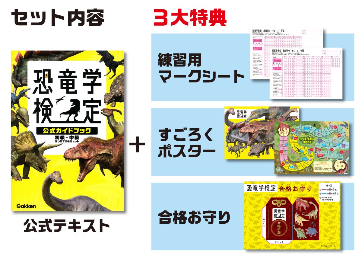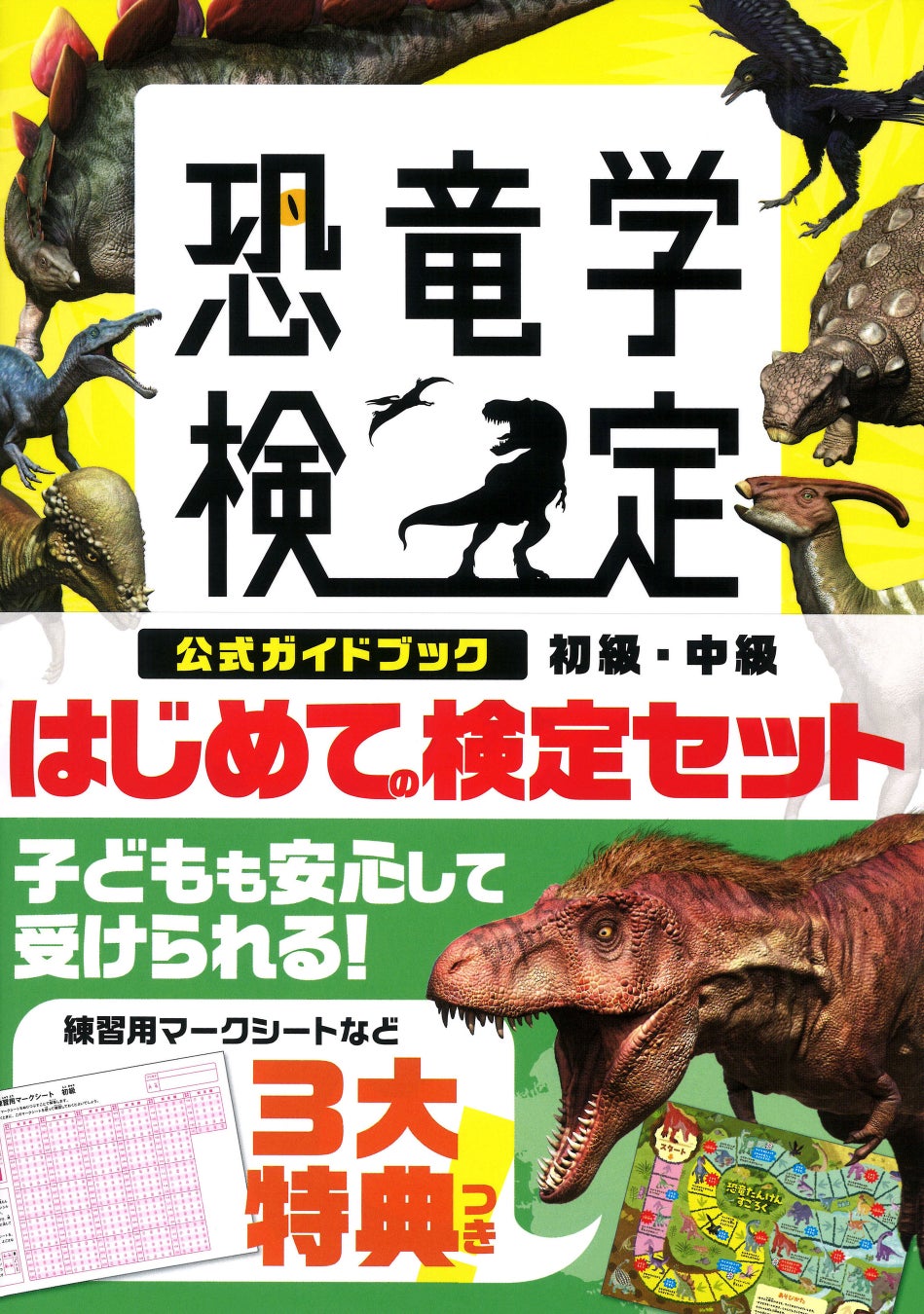 「恐竜は大好きだけど、検定を受けたことがないので受験を迷っている」というお子さまと保護者の方に向けた、公式テキストのスペシャル版『恐竜学検定公式ガイドブック 初級・中級 はじめての検定セット』が発売になりました。公式テキスト『恐竜学検定公式ガイドブック 初級・中級』に、本番と同じ仕様で解答できる「練習用マークシート」や、遊びながら学べる「すごろくポスター」、「合格お守り」の3大特典がついてきます。公式テキストだけの通常版も発売中です。