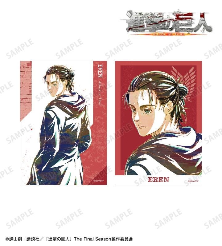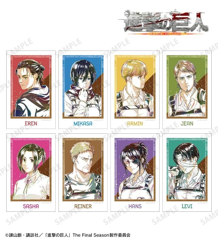 エレン、ミカサ、アルミン、ジャン、サシャ、ハンジ、リヴァイ、ライナーのイラストを新たなタッチで魅力的に表現し、ブロマイド2枚セットに仕上げました。