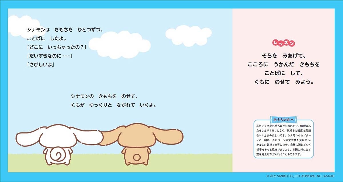 本書は、【おはなし】【しつもん】【レッスン】の3ステップで楽しく&わかりやすくアプローチ。お子さまに大人気のサンリオキャラクター・シナモロールの、「かなしい」気持ちにまつわる物語を読み進めていくことで、親子の会話を自然に広げながら、気持ちを理解し、適切に対処する力をはぐくみます。