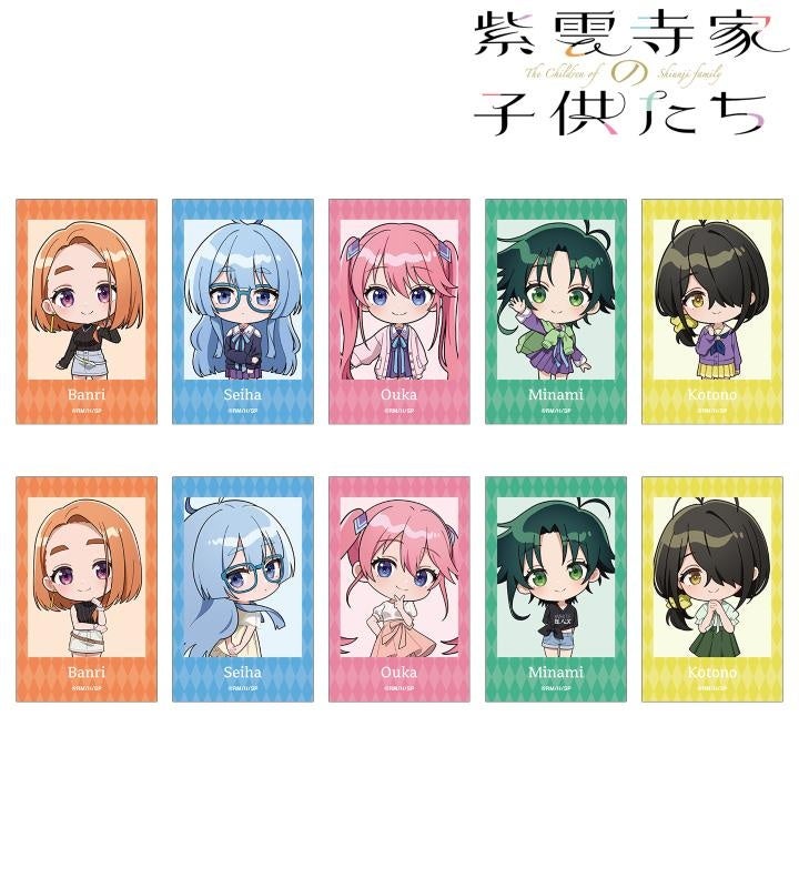 紫雲寺万里、紫雲寺清葉、紫雲寺謳華、紫雲寺 南、紫雲寺ことのの公式ちびキャライラストをメインにデザインし、イラストカードに仕上げました。
