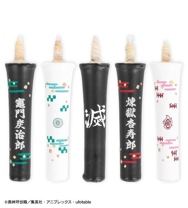 鬼殺隊は「滅」マーク、竈門炭治郎は名前と日輪刀の鍔・羽織の柄、煉󠄁獄杏寿郎は名前と日輪刀の鍔・炎の模様をイメージしたろうそくにデザインしました。