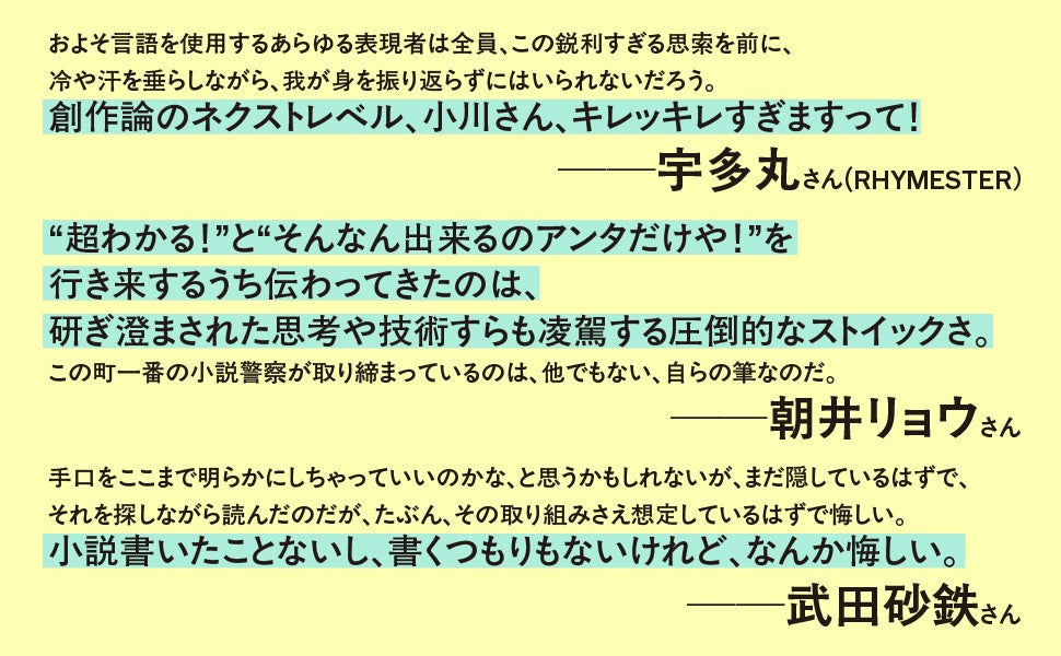 そんな小川さんが、自身の執筆時に考えていること(=企業秘密)をおしみなく開陳し、頭の中にあるものを言語化するための「思考術」をつづった『言語化するための小説思考』が10月23日(木)に発売されます。
