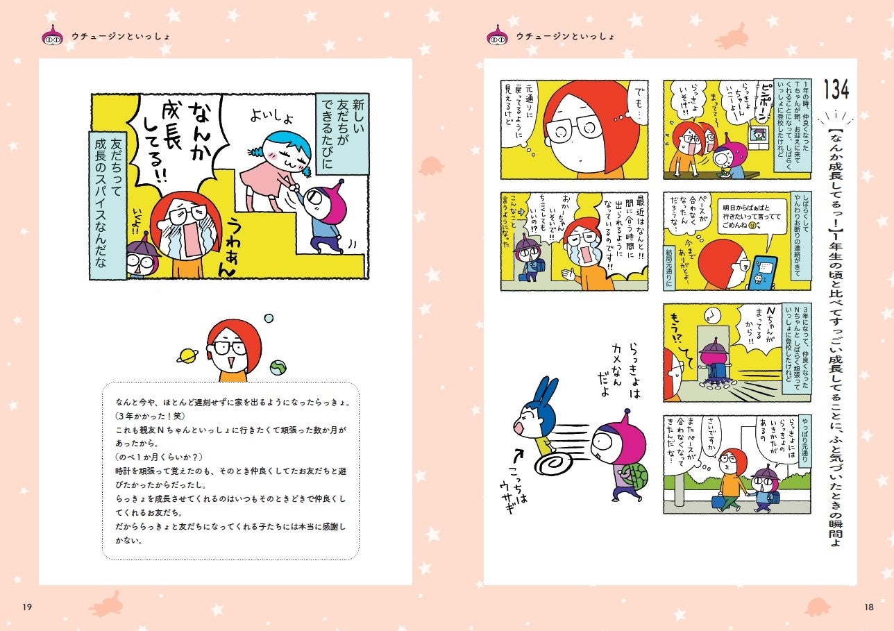 【連載版】10巻は、初めての親友・初めてのホテルビュッフェなどの初体験や、一家が胃腸炎でダウンの大事件を通して、ウチュージンの成長が垣間見えるほっこりエピソード13話を掲載。