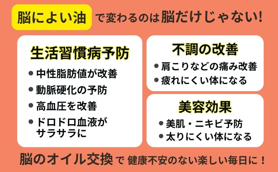 つまり、脳によい油を摂れば脳は元気になり健康を保ち、脳によくない油を摂り続けると脳は老化し衰えてしまうのです。