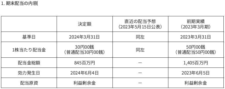 当社は、本日開催の取締役会において、2024年3月31日を基準日とする剰余金の配当を行なうことを下記のとおり決議しましたので、お知らせいたします。