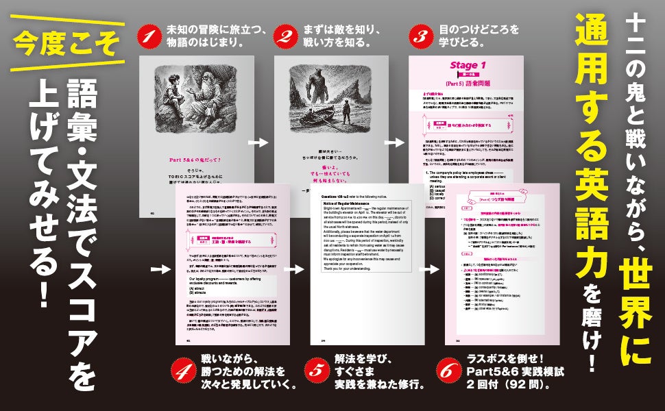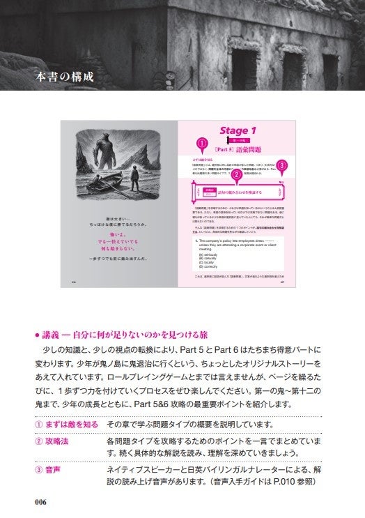 少しの知識と、少しの視点の転換により、Part5&6はたちまち得意パートに変わります。本書では、少年が鬼ノ島に鬼退治に行くという、ちょっとしたオリジナルストーリーをあえて入れています。ロールプレイングゲームとまでは言えませんが、ページを繰るたびに、1歩ずつ力を付けていくプロセスをぜひ楽しんでください。第一の鬼~第十二の鬼まで、少年の成長とともに、Part5&6攻略の最重要ポイントを紹介します。(本文より)