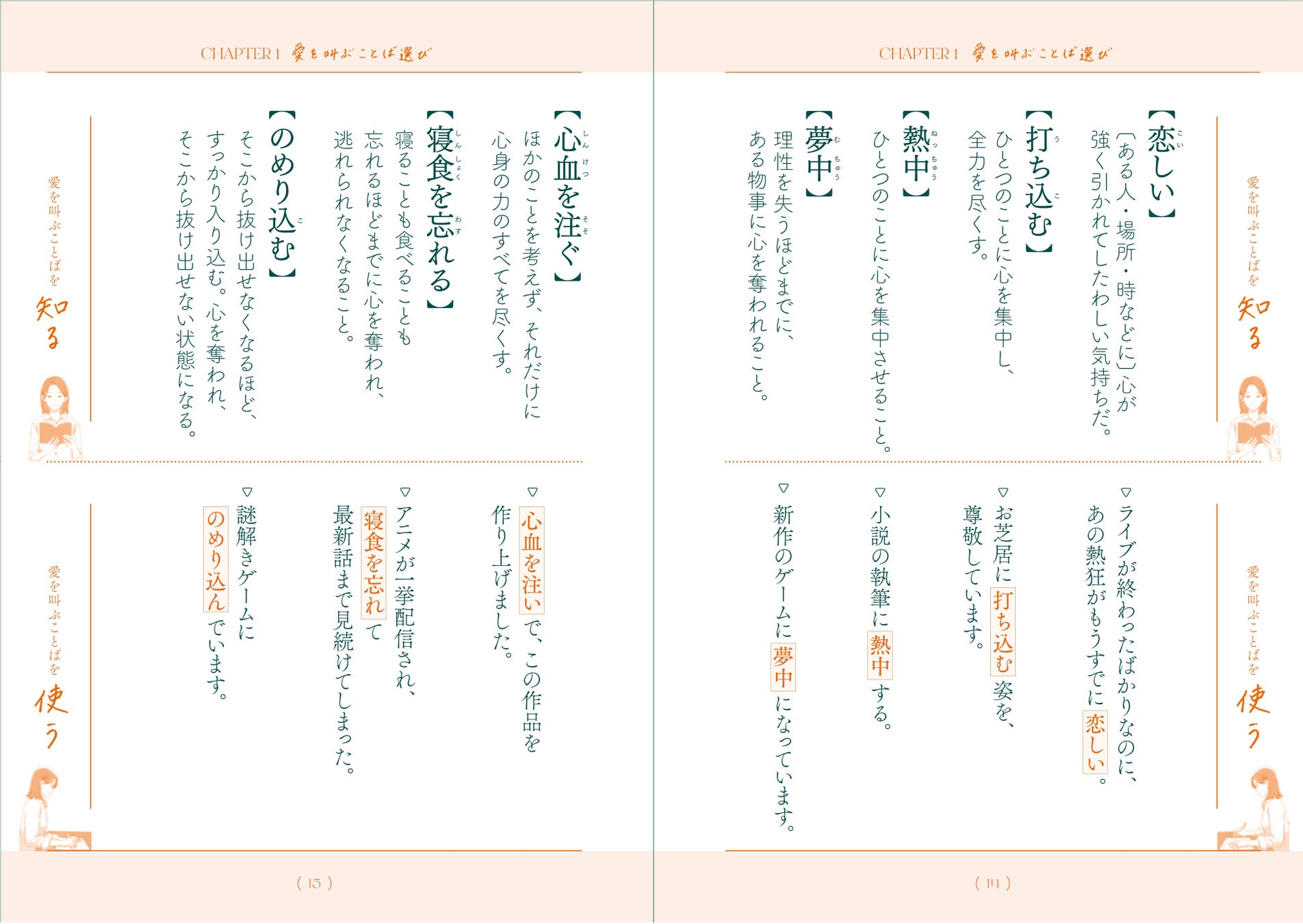 辞典の中から「好き」な気持ちを伝える300語を厳選し、「愛」「すごい」「かっこいい」「美しい」などに分類して収録しました。上段はミニ辞典、下段はファンレターやSNSで愛を叫ぶときに使う例文を掲載しています。