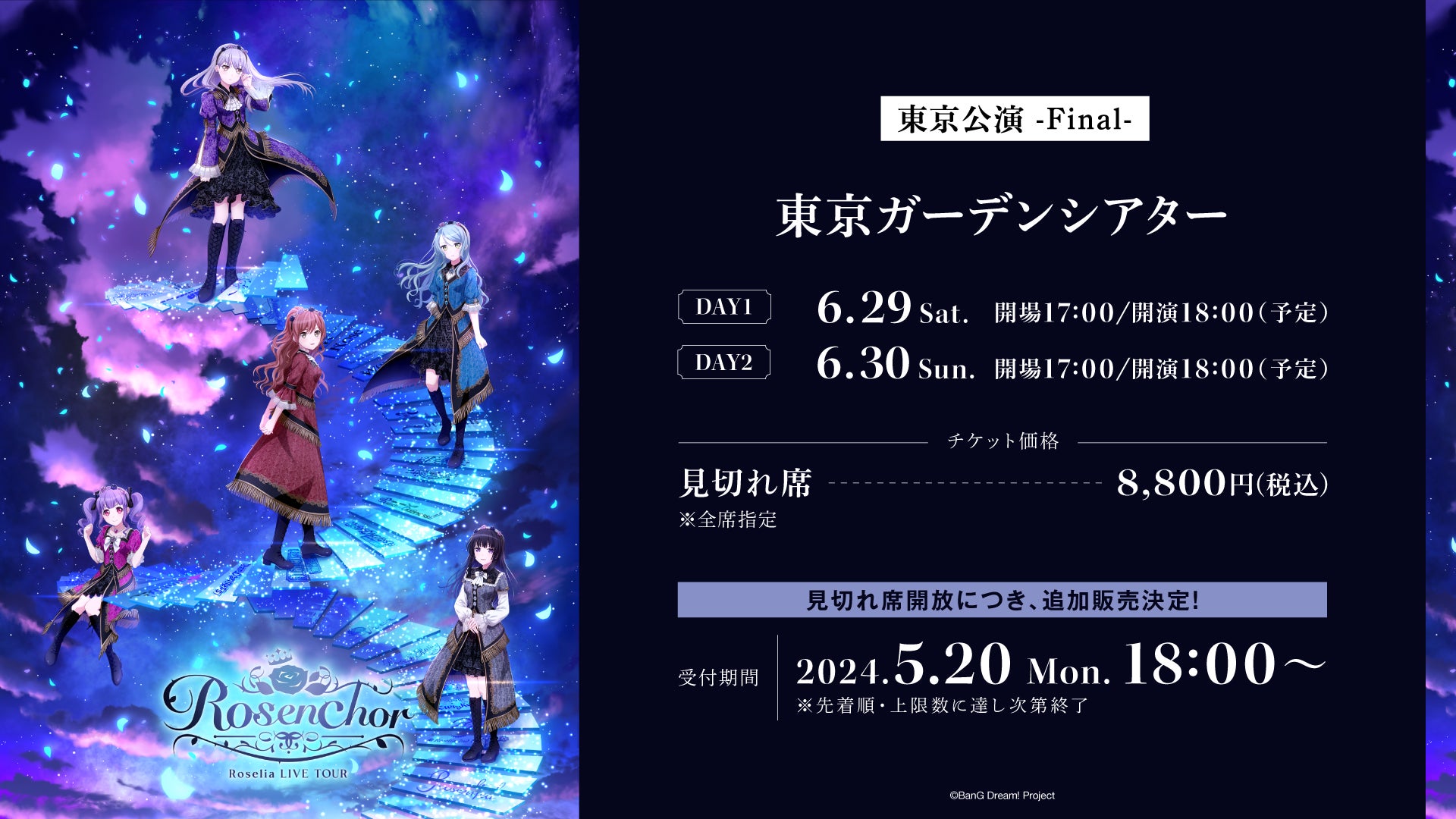 6月29日(土)・30日(日)に東京ガーデンシアターにて開催予定の、Roselia LIVE TOUR「Rosenchor」東京公演 -Final- について、「見切れ席開放による追加発売」と「ライブ有料配信」の実施が決定いたしました。
