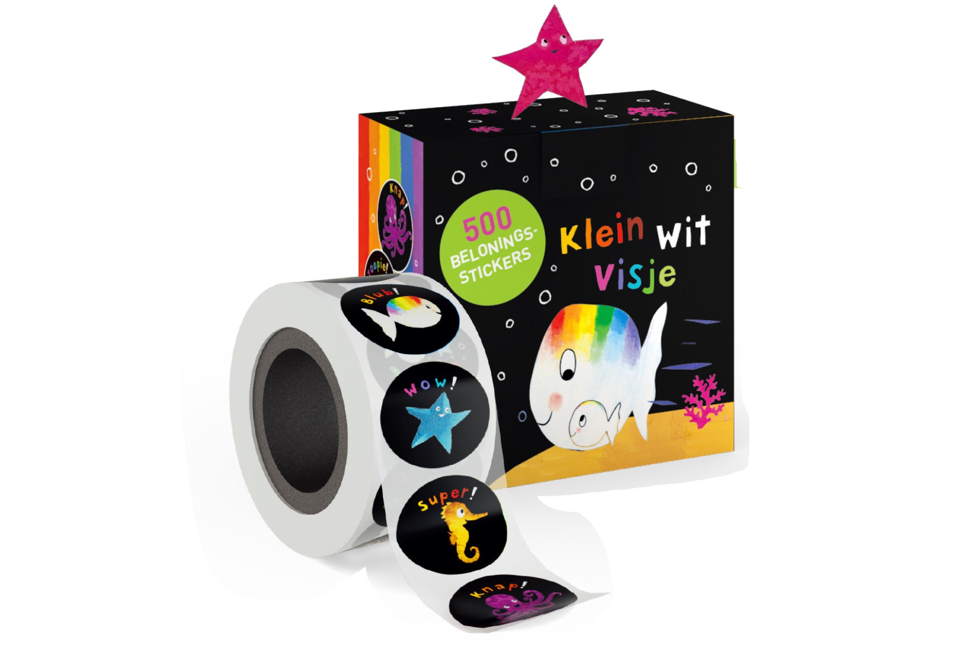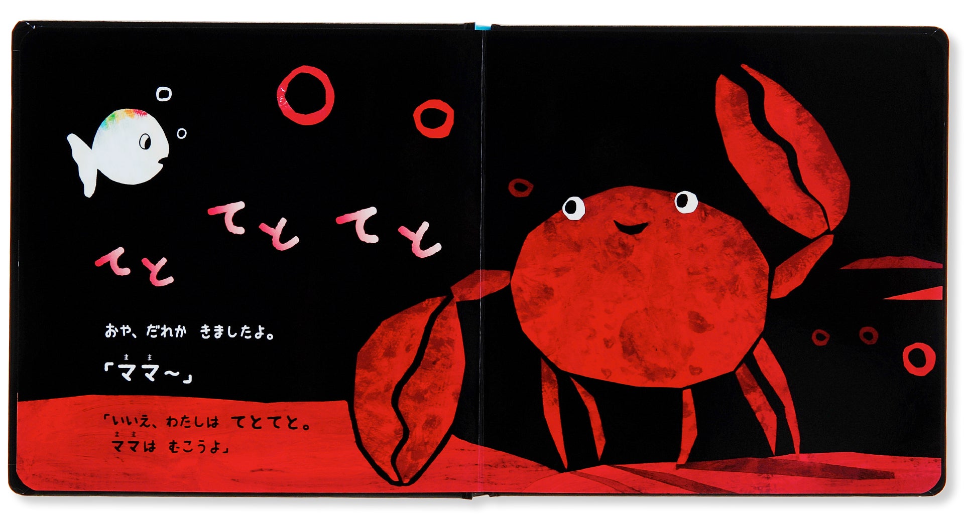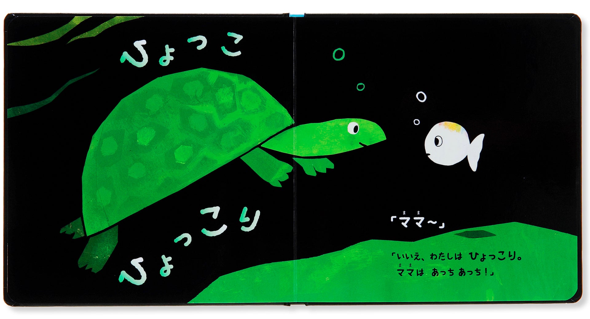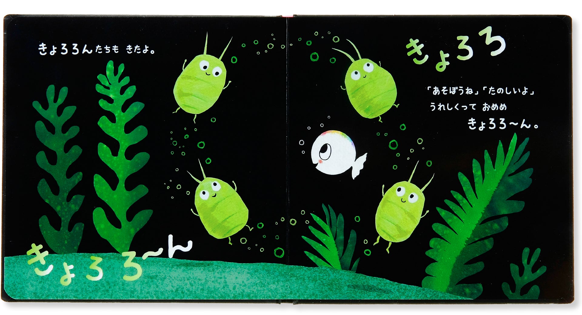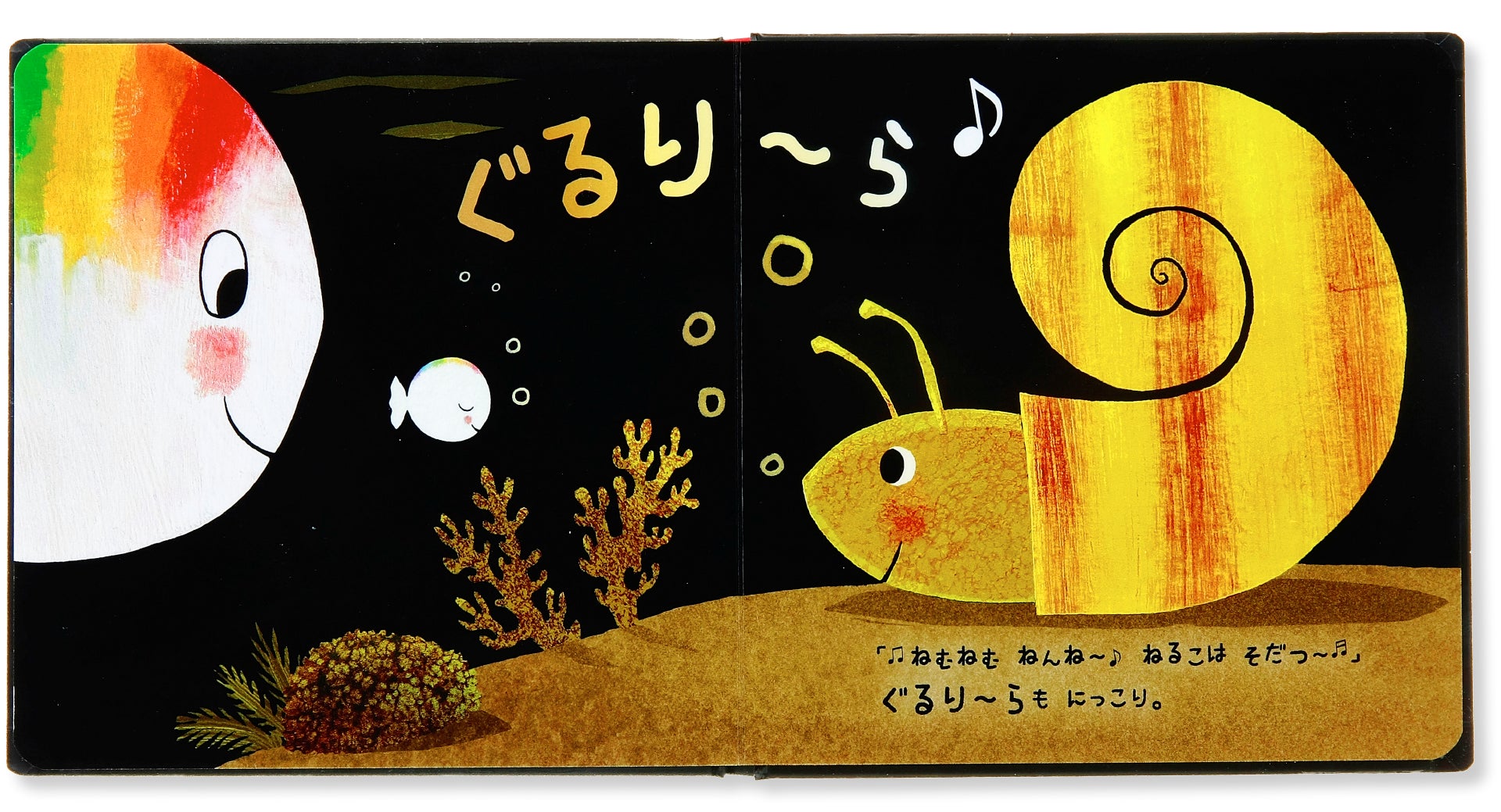 黒い背景にくっきりと映える、ちっちゃな白いおさかなちゃんと、ママパパ。そしてカラフルな海の仲間たち。