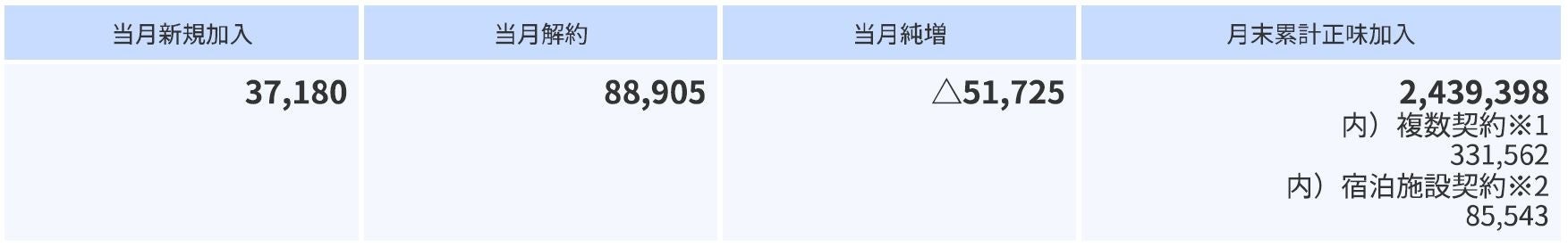 ※2:宿泊施設の客室で視聴するための宿泊施設事業者との契約については、視聴料金を個別に定めており、当該宿泊施設における契約客室の累計正味加入件(室)数は、月末累計正味加入件数に含めております。