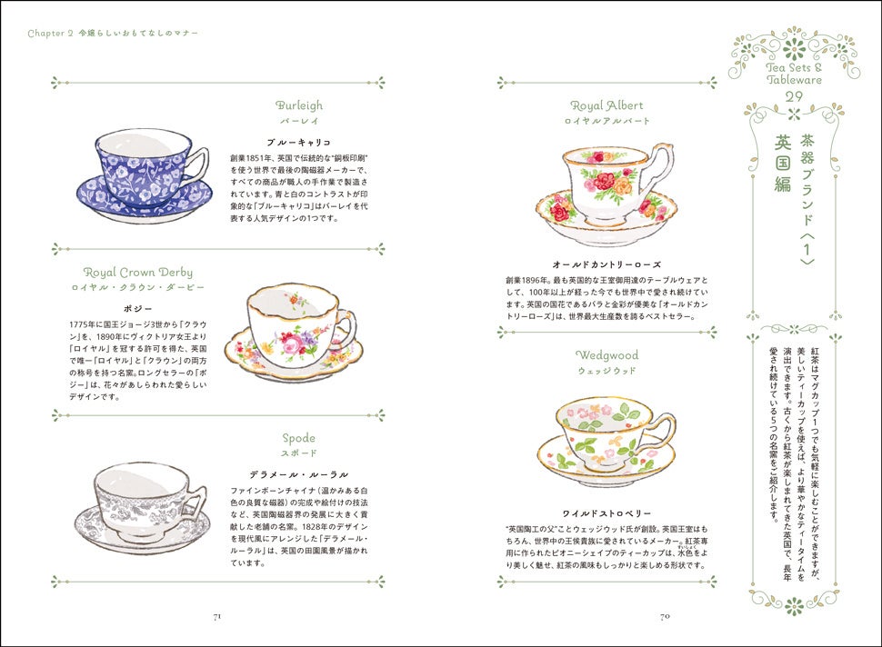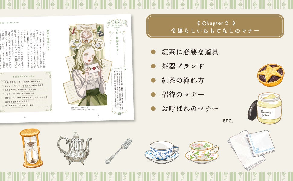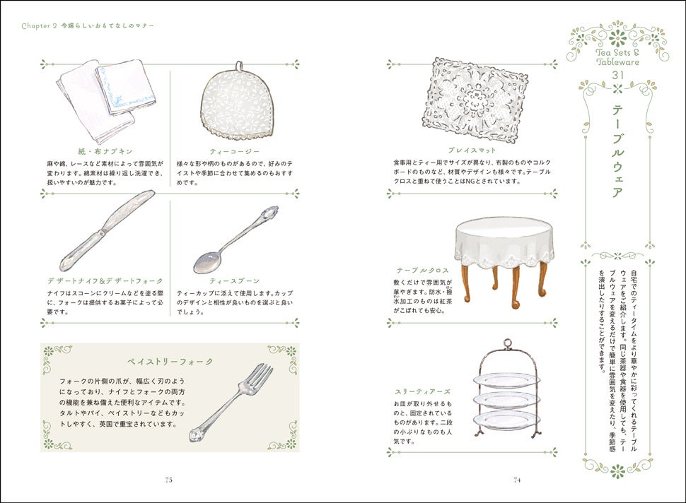 <Chapter2>「令嬢らしいおもてなしのマナー」では、美味しい紅茶の淹れ方や、ウェッジウッドをはじめとする世界の有名な茶器ブランド、そろえておきたいテーブルウェアのほか、英国流の季節ごとのおもてなし、招待やお呼ばれの際のマナーなど、自宅でも「お嬢様」気分で楽しめる知識をイラストたっぷりで紹介します。