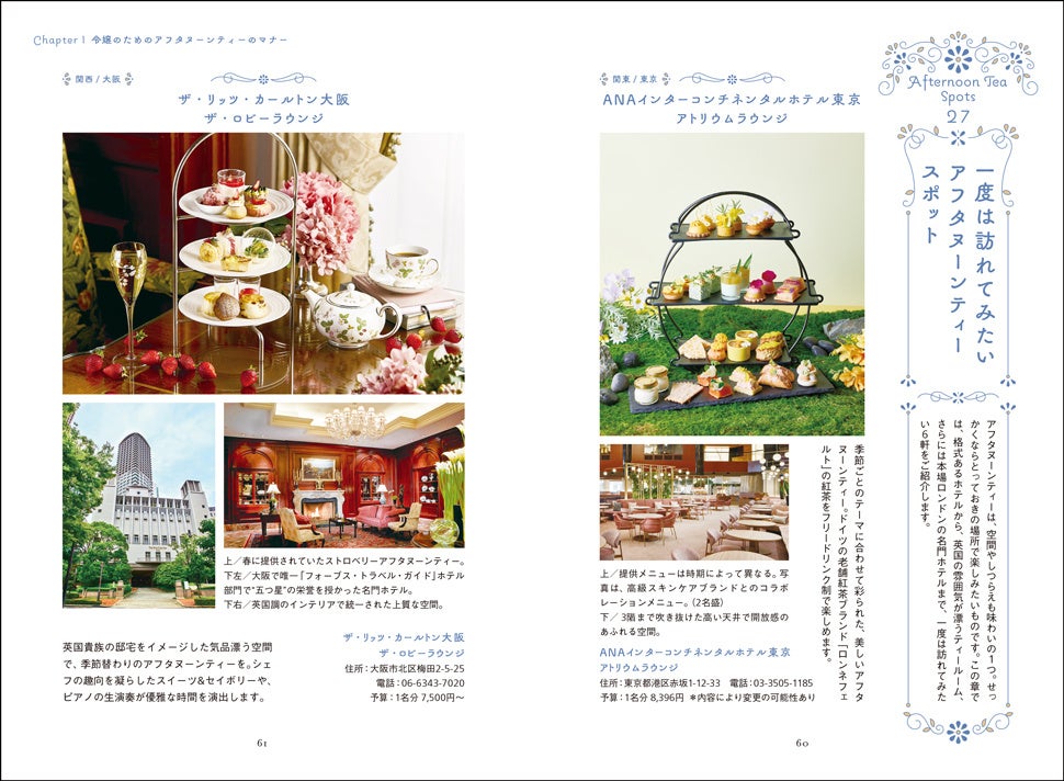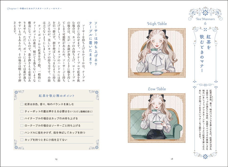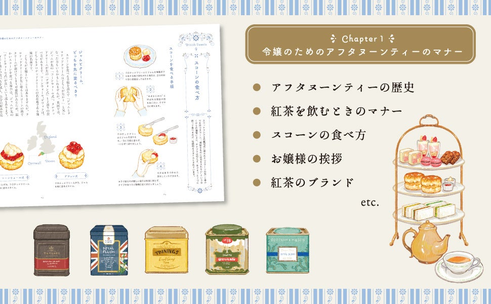 <Chapter1>「令嬢のためのアフタヌーンティーのマナー」では、かつて英国の貴婦人の間で大流行し、一般にも広く浸透していった「アフタヌーンティー」の歴史や豆知識、マナーのほか、世界で人気の紅茶ブランドの数々、茶葉とスイーツの相性、一度は訪れてみたいアフタヌーンティースポットなど、ヌン活好きさんに役立つ知識が満載です。
