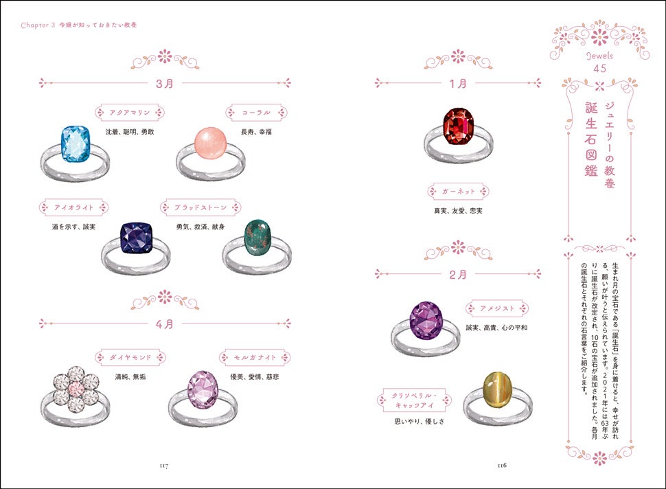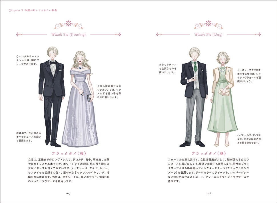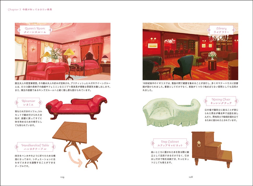 <Chapter3>では、「令嬢が知っておきたい教養」として、公爵や伯爵といった英国貴族の爵位の解説や、かつて貴族令嬢の間で流行した紅茶占いのやり方、ドレスの歴史、貴族の邸宅の調度品、舞踏会などの社交界の教養を紹介。宝石言葉や花言葉など、令嬢が知っておきたい、ときめく知識もイラストたっぷりで学べます。
