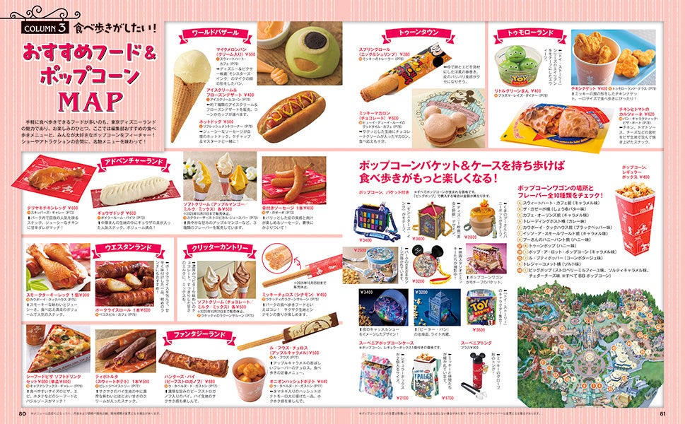 レストランはテーマランド別に紹介しているので、今いるところにどんなレストランがあるのか探しやすいのがポイント。人気のメニューをチェックして、何が食べたいかを吟味しましょう。みんな大好きなポップコーンもMAPつきで紹介しています。