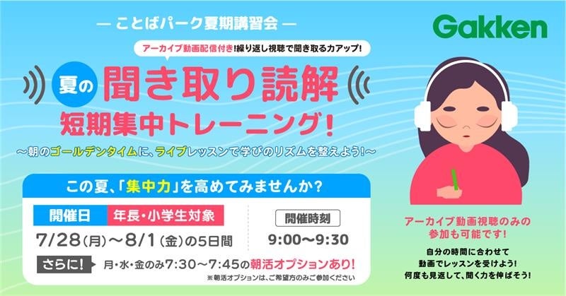 株式会社 学研ホールディングス(東京・品川/代表取締役社長:宮原博昭)のグループ会社、株式会社学研エデュケーショナル(東京・品川/代表取締役社長:川端篤)は、国語に特化したオンライン学習プログラム「ことばパーク」において、7月28日(月)~8月1日(金)の5日間限定で、「ことばパーク夏期講習会~夏の聞き取り読解短期集中トレーニング!」~を開催いたします。