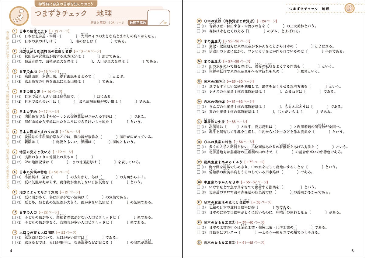 全点共通で「つまずきチェック」のコーナーを掲載。学習前に「どこがわかっていないのか」を見える化できるから、効率よく学習がスタートできます。