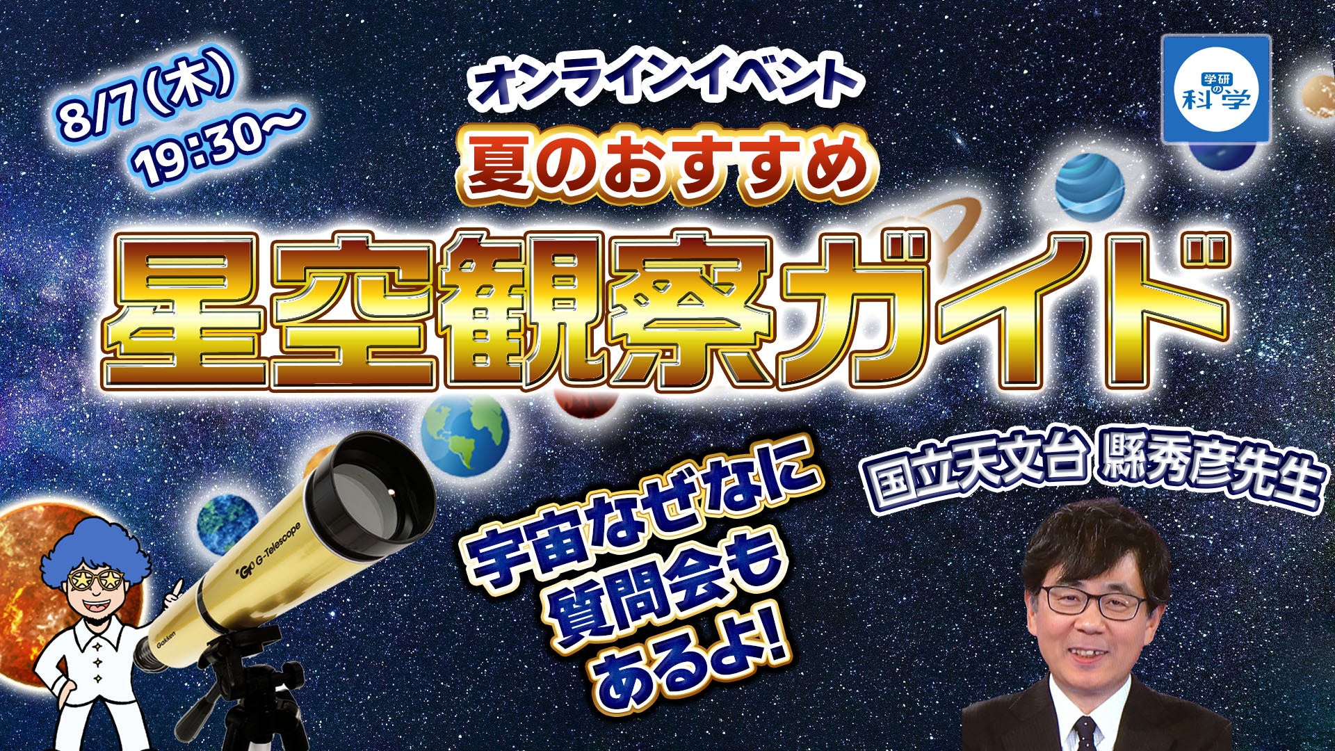 宇宙のスペシャリスト・縣秀彦先生をゲストに迎えて、この夏に見たいイチオシ天体をYouTube生配信で紹介します。「宇宙なぜなに質問会」では、チャットで星や宇宙についての疑問を先生に教えてもらうことができます。