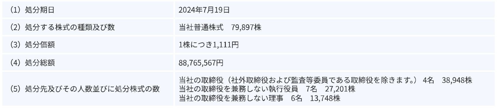 当社は、2024年6月20日開催の取締役会において、下記のとおり、譲渡制限付株式報酬としての自己株式の処分(以下「本自己株式処分」又は「処分」といいます。)を行うことについて決議いたしましたので、お知らせいたします。