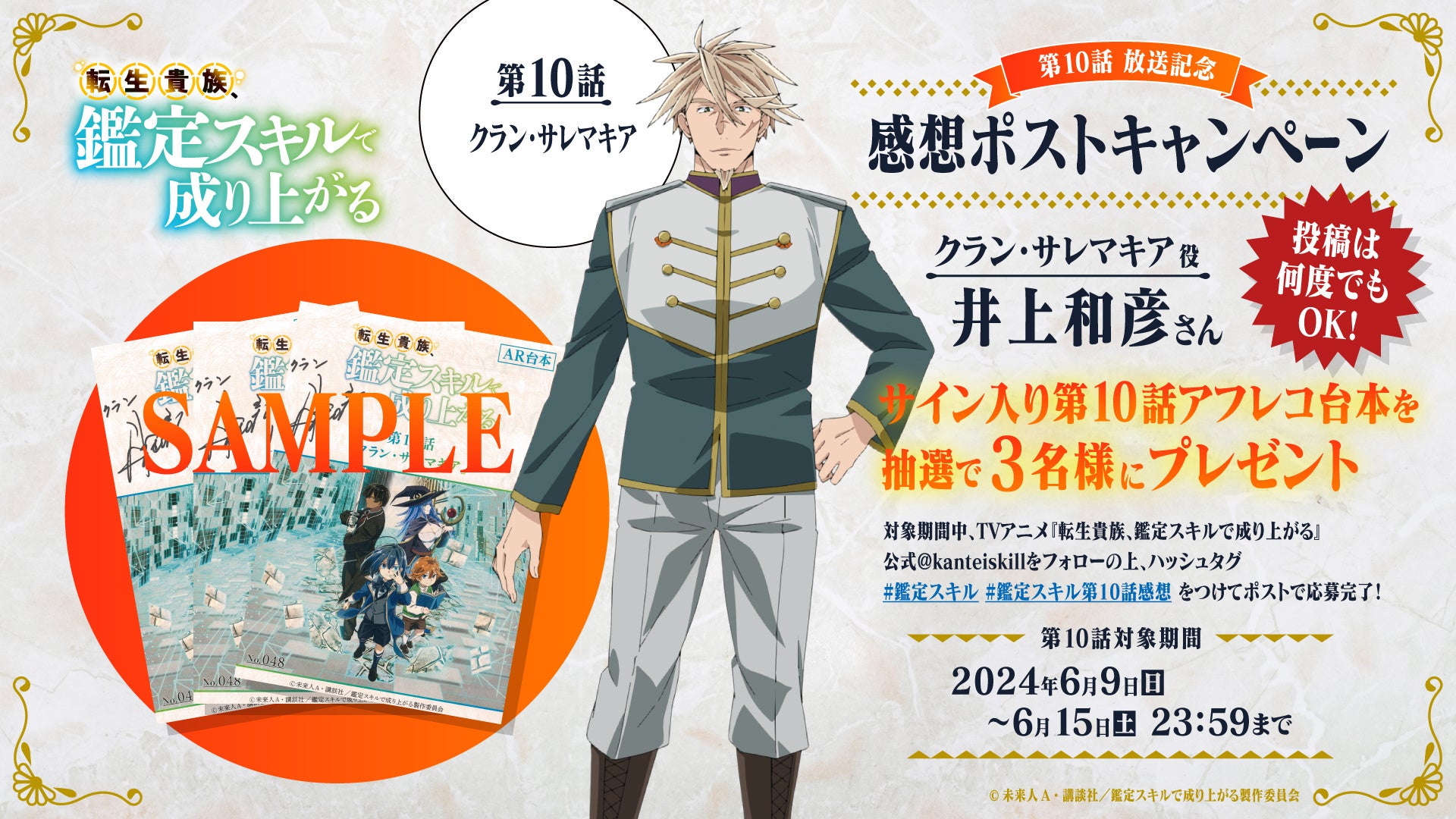 TVアニメ『転生貴族、鑑定スキルで成り上がる』第10話放送を記念して、クラン・サレマキア役 井上和彦さんのサイン入り第10話台本を、3名様にプレゼントいたします。