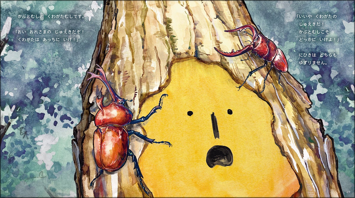 疲れた様子のスズメバチ、恋人がほしいオオムラサキ、カブトムシとノコギリクワガタは「じゅえきくん」を巡ってけんかになりそうに…。