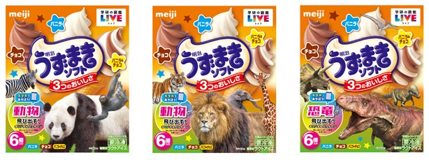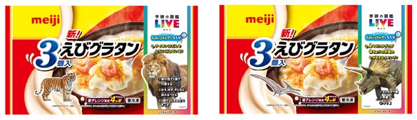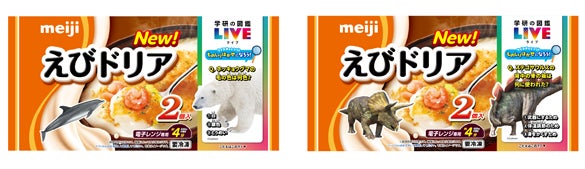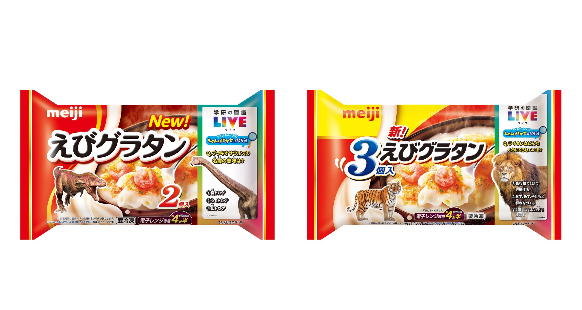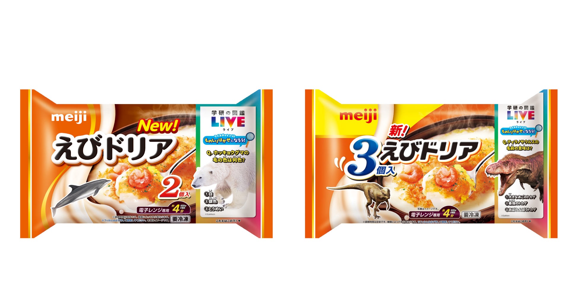 『学研の図鑑LIVE』とのコラボパッケージで「明治 うずまきソフト」「明治 角10棒アイスソーダ」「明治 えびグラタン」「明治 えびドリア」が登場!