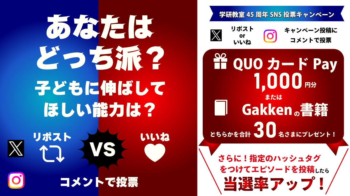 株式会社 学研ホールディングス(東京・品川/代表取締役社長:宮原博昭)のグループ会社、株式会社学研エデュケーショナル(東京・品川/代表取締役社長:川端篤)は、「これからの未来を生きる子どもたちに育んでほしい力」をテーマにしたSNS投票キャンペーンを7月7日(月)より、X(旧Twitter)、Instagramにて開催いたします。