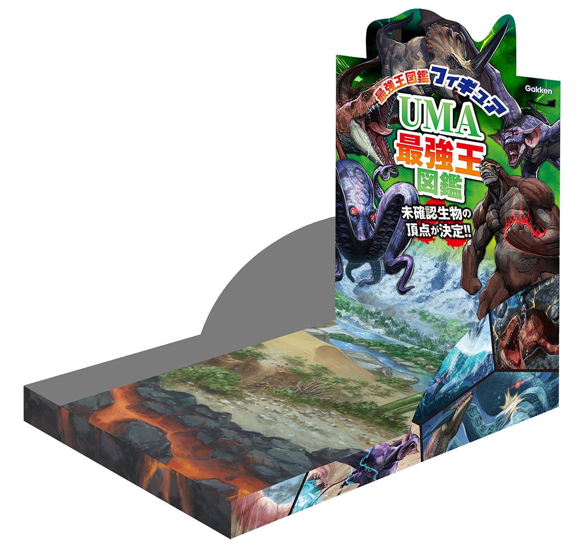 コンプリートBOXの箱は、組み立てるとバトルフィールドになるスペシャルな仕様。好きなフィギュアを並べて飾れることができる!『UMA最強王図鑑』のバトルを再現したり、オリジナルのバトルを展開したりして遊ぼう。