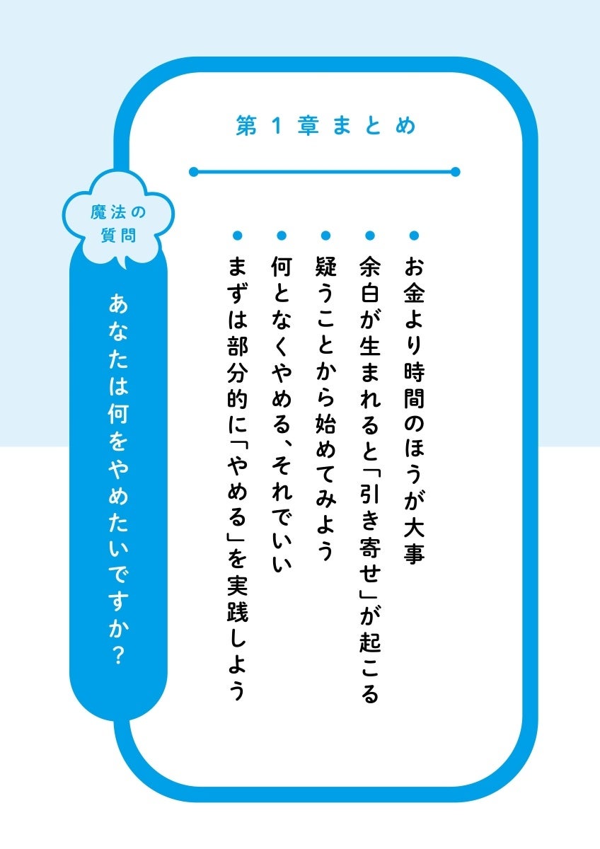 まず何をやめるべきか、「やめたいこと」が決められない方のために、思考を深掘りする【マンダラチャート】と【魔法の質問】を紹介しています。この2つのメソッドを使えば「何をやめればいいか」「何をやめないほうがいいか」の方針を立てることができます。