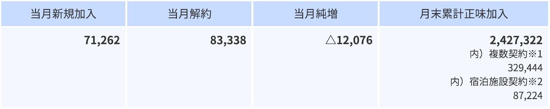 ※2:宿泊施設の客室で視聴するための宿泊施設事業者との契約については、視聴料金を個別に定めており、当該宿泊施設における契約客室の累計正味加入件(室)数は、月末累計正味加入件数に含めております。