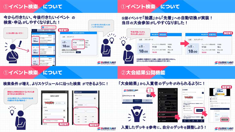 ブシナビはブシロードがお届けするトレーディングカードゲーム大会・イベントへの申し込みから当落の確認、当日の対戦結果入力までワンストップで行えるツールです。