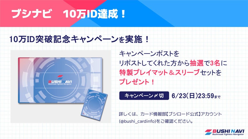 ブシロード公式TCGツール「ブシナビ」の登録ID数10万件突破を記念し、カード情報部Xアカウント(https://twitter.com/bushi_cardinfo)にて、抽選で3名様に「ブシナビロゴ入り特製ラバーマット&スリーブセット」が当たるキャンペーンを実施します!