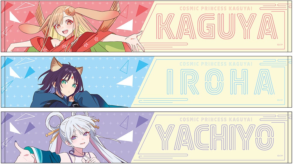 VRバトル衣装のかぐや、酒寄彩葉、月見ヤチヨたち3人の描き下ろしイラストを使用した「アクリルスタンド」や「キャラバッジコレクション」をラインナップするほか、推しの応援にピッタリの「応援うちわ」、「マフラータオル」などの多数のグッズを発売いたします。