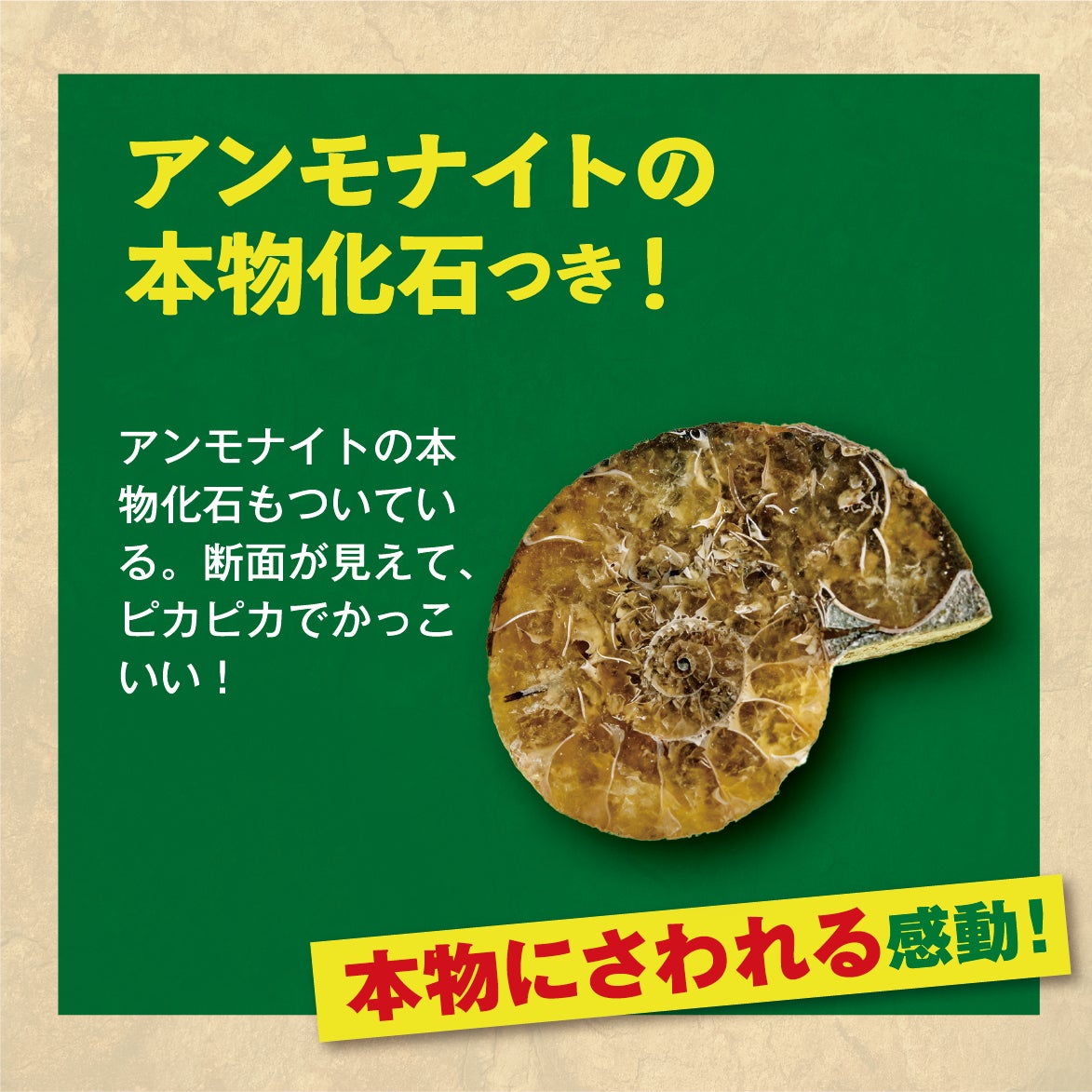 アンモナイトの本物化石もついています。断面が見えて、ピカピカしていてかっこいい! 恐竜時代のロマンを感じられます。