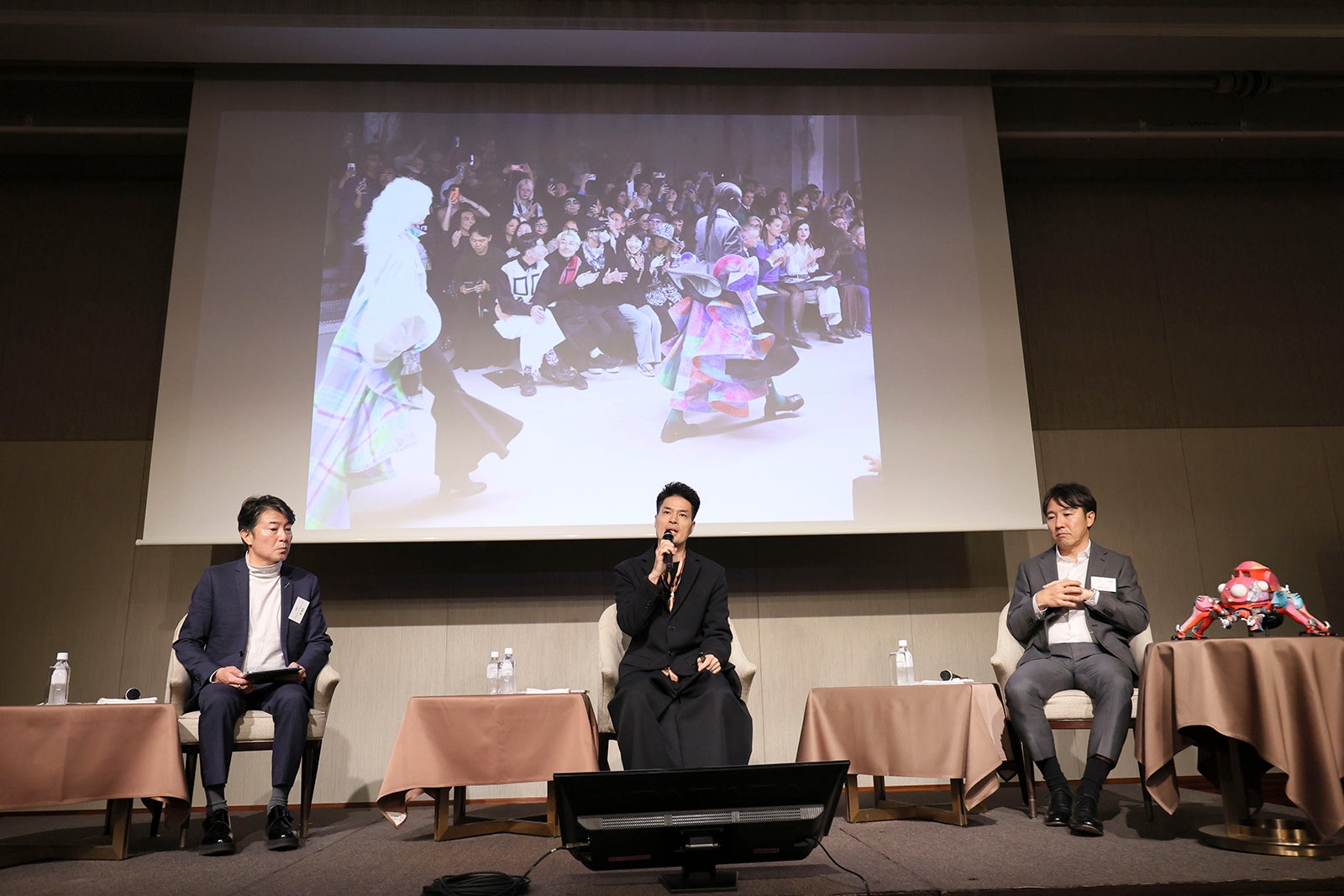 続いての登壇は、株式会社ヘラルボニー 最⾼執⾏責任者/COO 曽根秀晶さんと、講談社 コーポレート企画部 部⻑ 森本達也。MCはFRaU エグゼクティブ・プロデューサー 関 ⿓彦。カンヌライオンズ2025で「Glass: The Lion for Change」部門ゴールドを受賞したヘラルボニーと、講談社が共に歩んだコラボレーションの軌跡を振り返りました。
