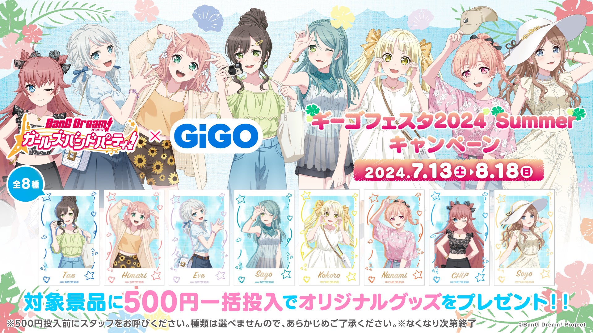 対象のGiGOグループのお店にて『バンドリ! ガールズバンドパーティ! ギーゴフェスタ 2024 Summer』の開催が決定!描き下ろしイラストを使用したオリジナルグッズの販売や、プライズ景品に加えてバンドリ!焼き&ノベルティ付きドリンクの販売を行います。