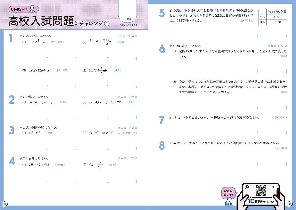 紙面の二次元コードを読み取ると、オリジナルの授業動画を見ることができます。授業動画は、わずか10分の間に重要なポイントが詰まっているので、学校行事などで忙しい中学生にもピッタリ! 中学3年間の総復習がスピーディーに完了できます。
