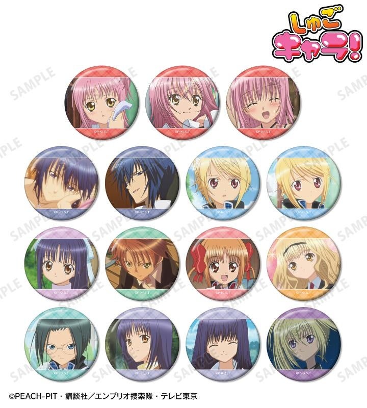 日奈森 あむ、月詠 イクト、辺里 唯世、藤咲 なでしこ、相馬 空海、結木 やや、真城 りま、三条 海里、藤咲 なぎひこ、ほしな 歌唄の印象的なシーンを缶バッジに仕上げました。
