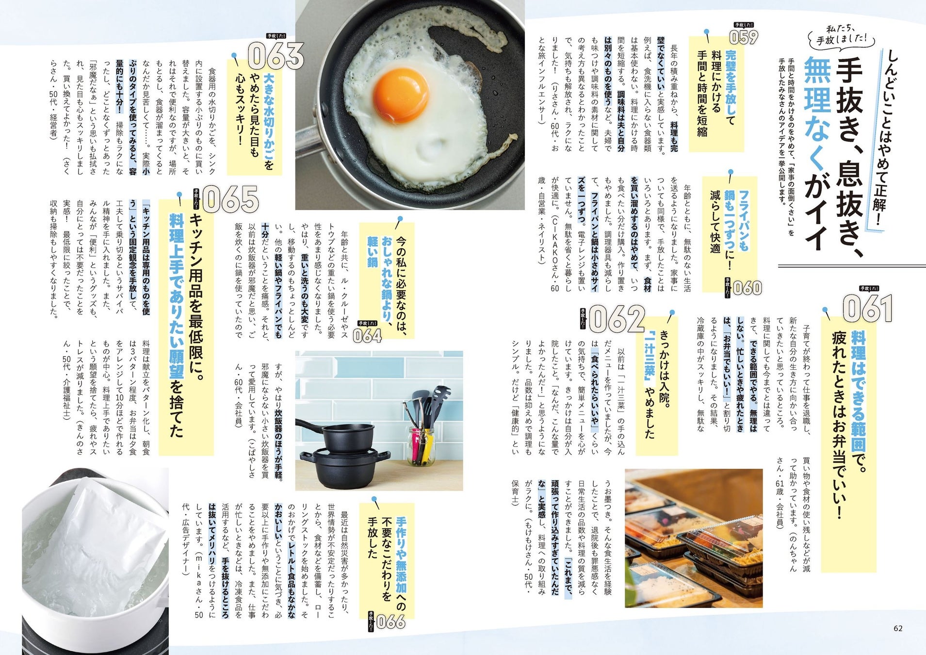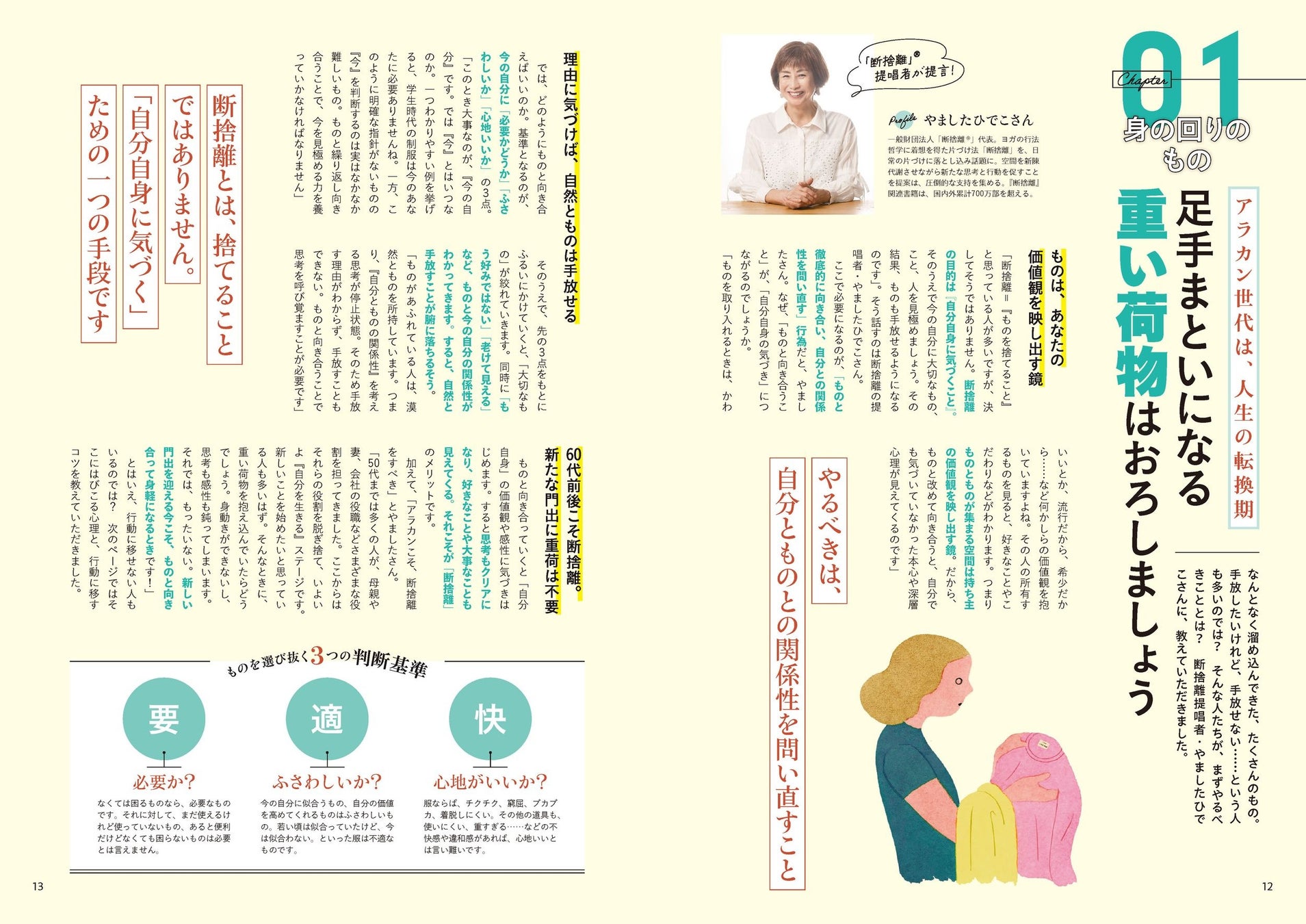 断捨離提唱者のやましたひでこさんをはじめ、ごみ清掃芸人・マシンガンズ滝沢秀一さん、料理研究家・藤井恵さんら専門家ならではのしっかりしたアドバイスや、同世代インフルエンサー、読者の方々のリアルな手放し体験談を<身の回りのもの><執着心><人間関係><家事・暮らし><健康・美容習慣>と5つのテーマに分けて、たっぷりとご紹介。どこから読んでも、”じょうずにスッキリ手放す”ためのコツやヒントがきっと見つかる。そんな一冊になっています。