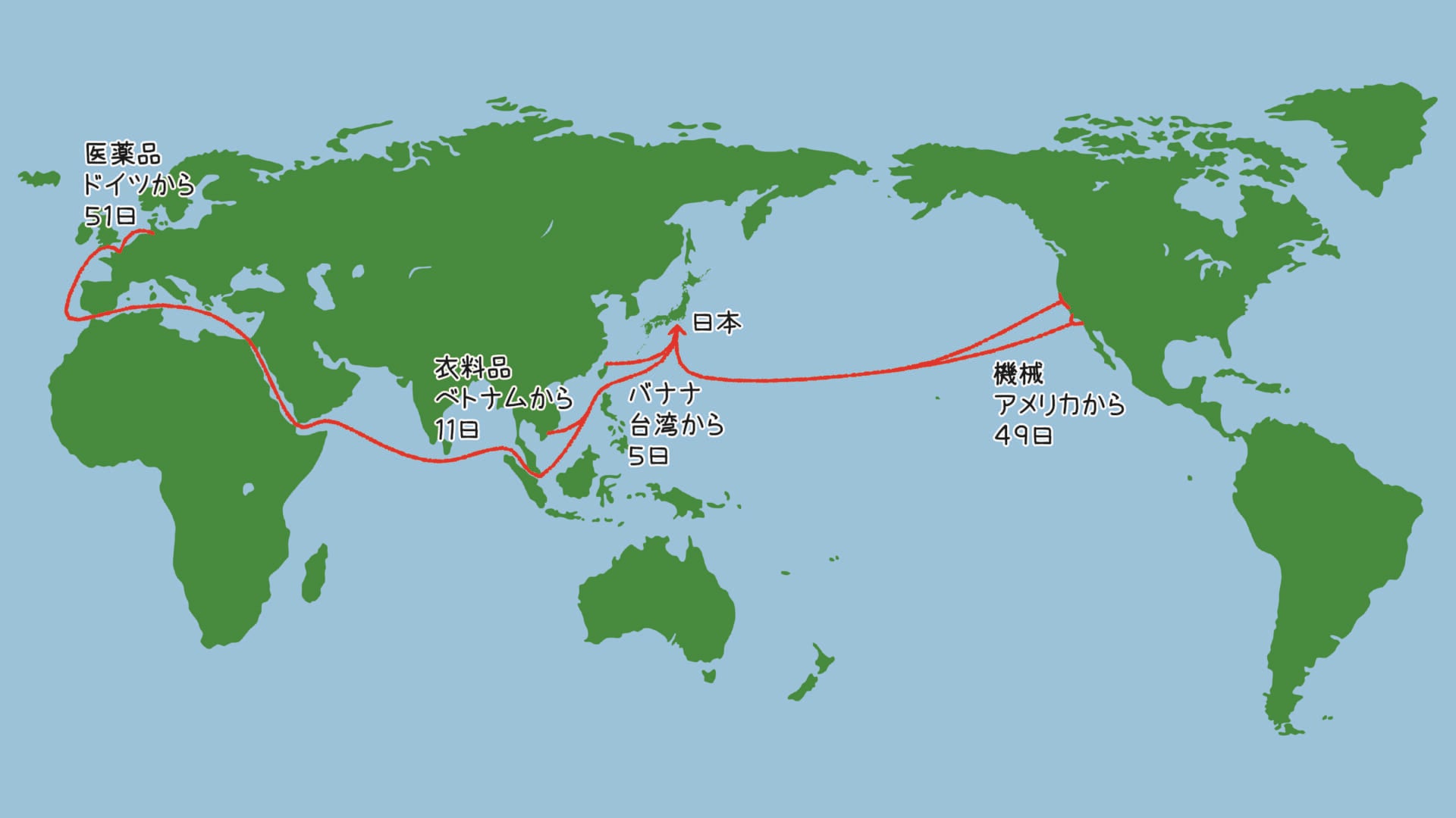 例えば、フルーツなどの食べ物、ゲーム機などの機械、Tシャツなどの衣料品、医薬品について、どこから、どうやって届いているかを調べます。