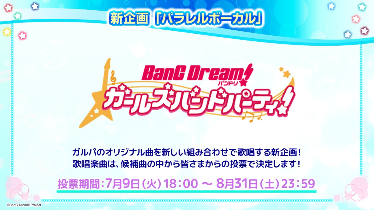 新企画「パラレルボーカル」の開催が決定いたしました。第1弾投票期間は7月9日(火)18時から8月31日(土)23時59分までを予定しており、ゲーム内のホーム画面左下のバナーより投票いただけます。