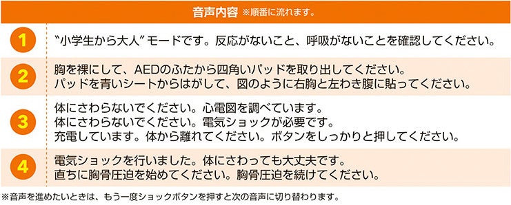 実際にAEDに使用されている音声を収録しており、緊迫感が伝わります。