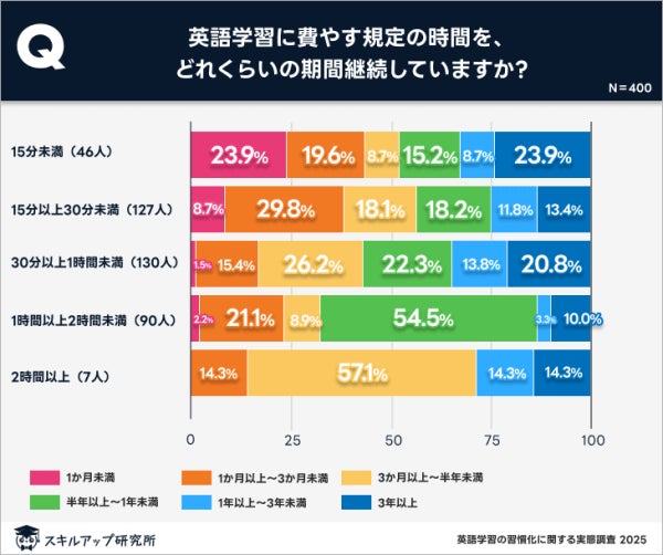 この結果から、1日あたり30分〜2時間程度の学習時間は、英語学習を長期的に習慣化しやすい最適なボリュームであることが示されている。