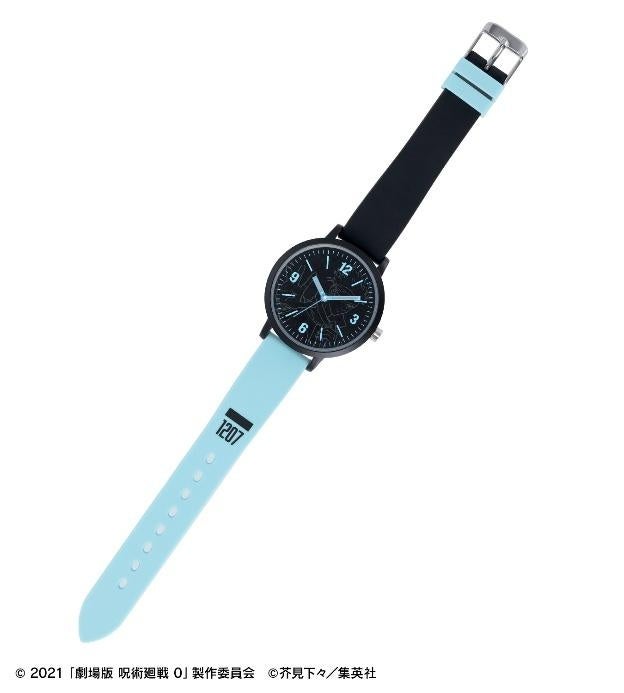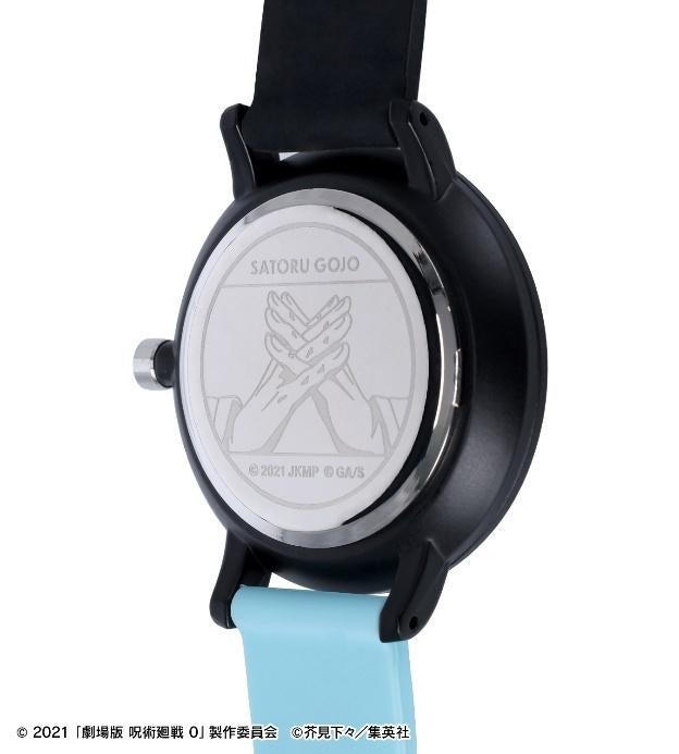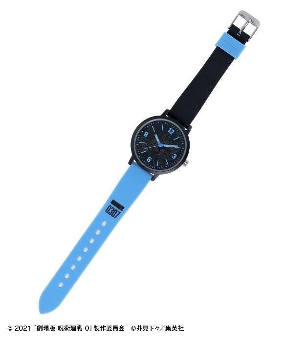 文字盤には五条 悟のイラストをプリントし、針やインデックスにも同様にキャラクターをイメージしたカラーを採用。