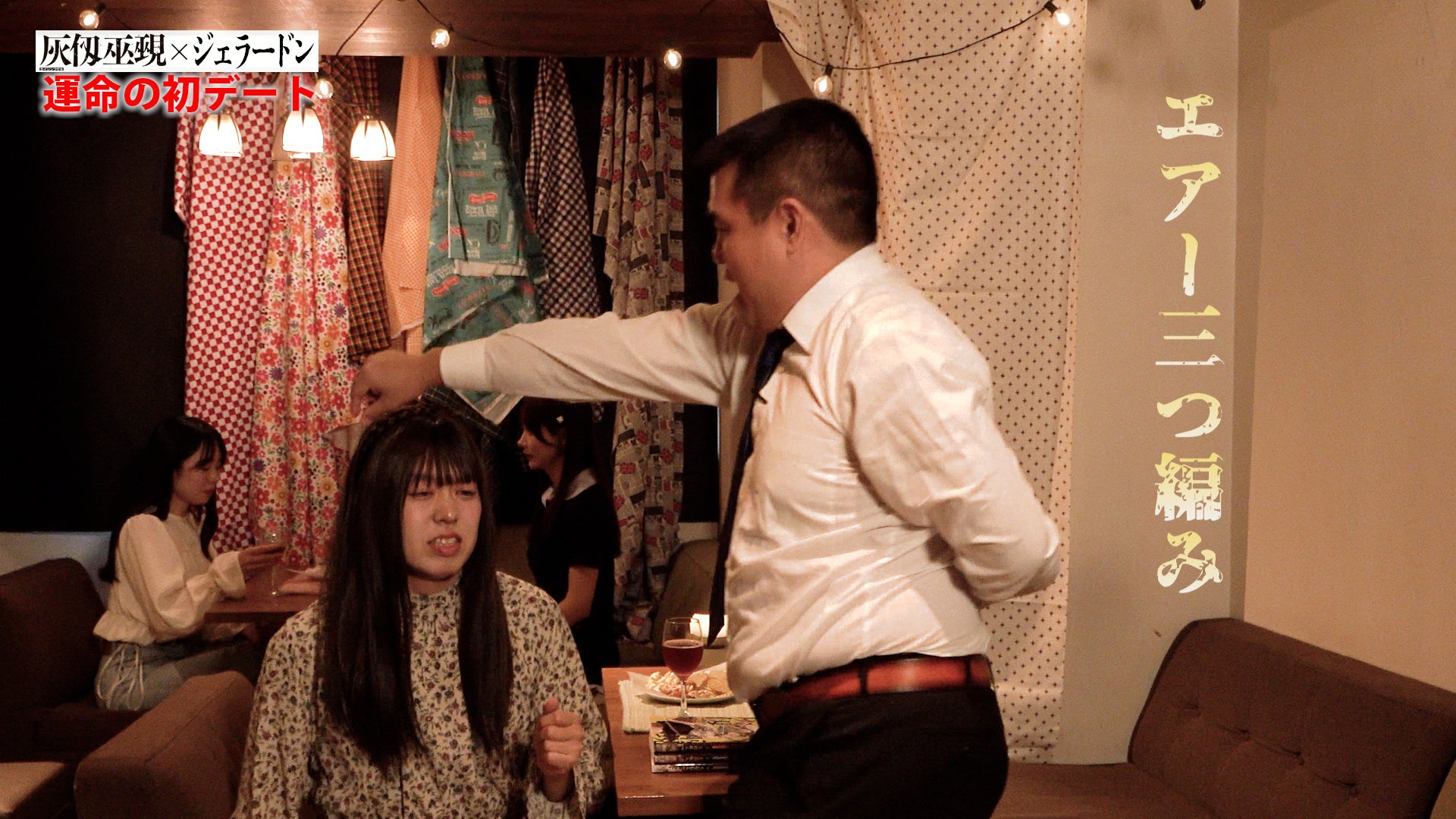 『灰仭巫覡』(カイジンフゲキ)は少年たちの成長を描く和風ファンタジー作品だが、コントはマッチングアプリで初めて会う男女のやりとりになっており、主人公の仭を名乗るジェラードンのアタック西本が